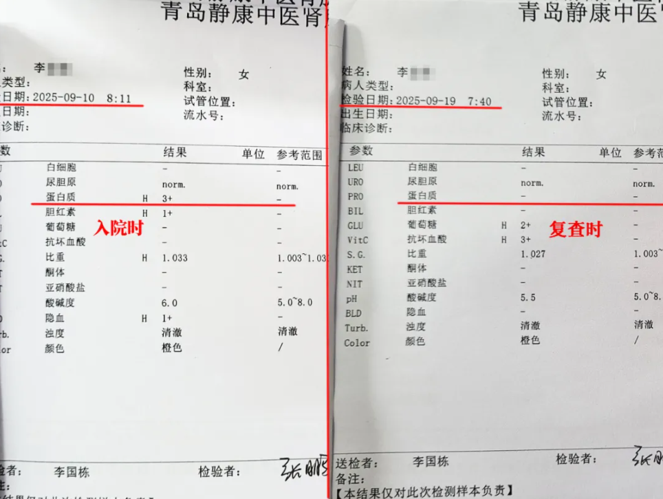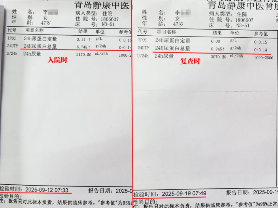 【诊断】 肾病综合征、低蛋白血症、高脂血症等。 【入院时】 患者尿蛋白3+,高度水肿,24小时尿蛋白总量高达6.748g,白蛋白25.4g/L。 【出院时】 尿蛋白转阴,体重减少18斤,水肿消退,24小时尿蛋白总量降至0.245g,白蛋白升至36g/L。 李国栋主任查房时,把治疗后的化验单拿到患者李女士床头。看着化验单上明显好转的数值,李女士难掩激动之情。 李女士是一位肾病综合征患者,她的治病经历颇为曲折。十几年前,她曾在青岛静康中医肾脏病医院(http://www.qdsjksbyy.com/)接受过治疗,经过大约1年的系统治疗,病情获得明显改善。后在医生专业评估下,逐渐将所有药物全部停用,病情稳定至今。
