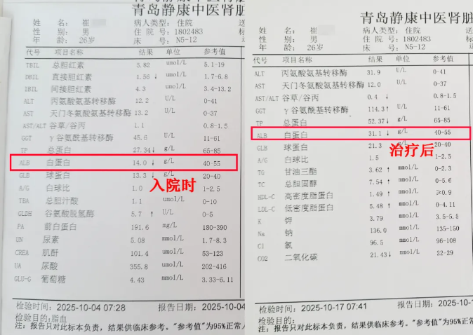 面对复发的病情,于医生在详细问诊中,找到了背后的真相。原来,在停药后的这一年里,崔先生早已将“生活管理”抛之脑后: 1、长期熬夜:作息极不规律,身体得不到应有的修复。 2、饮食放肆:早已忘记“低盐、优质低蛋白”的饮食原则,重口味、高蛋白食物来者不拒。 3、烟不离手:尼古丁等有害物质持续损害着肾脏的微小血管。 4、饮酒无度:酒精及其代谢产物加重了肾脏的负担。 正是这四大“健康杀手”的长期围攻,让本已脆弱的肾脏功能再次亮起了红灯。此次的腹泻,不过是压垮骆驼的最后一根稻草,彻底引爆了蓄积已久的健康危机。 查房时,张新安院长强调:对于肾病综合征患者而言,尿蛋白转阴、临床治愈只是一个阶段的胜利,绝非终点。后续的“生活管理”是维持病情稳定、防止复发的不可或缺的第二战场,其重要性丝毫不亚于药物治疗。 所幸,崔先生及时回到了正确的轨道上。根据他复发后的病情,我院为其制定了紧急且有针对性的中西医结合治疗方案。通过发明专利“循经护肾治疗仪”系统治疗,配合利尿消肿的中医药,同时结合严格的饮食管理和生活指导,半个月的时间,崔先生的病情很快得到控制:体重下降了约30斤,身体的水肿完全消除,血液中的白蛋白也稳步回升至31g/L,精神状态和身体机能都得到了显著改善。 崔先生这“30斤水肿”的教训,也为所有肾病患者敲响了警钟。只有将健康的生活方式内化为一种习惯,才能为脆弱的肾脏筑起一道坚实的防护墙,真正守住来之不易的治疗成果,享受高质量的健康生活。