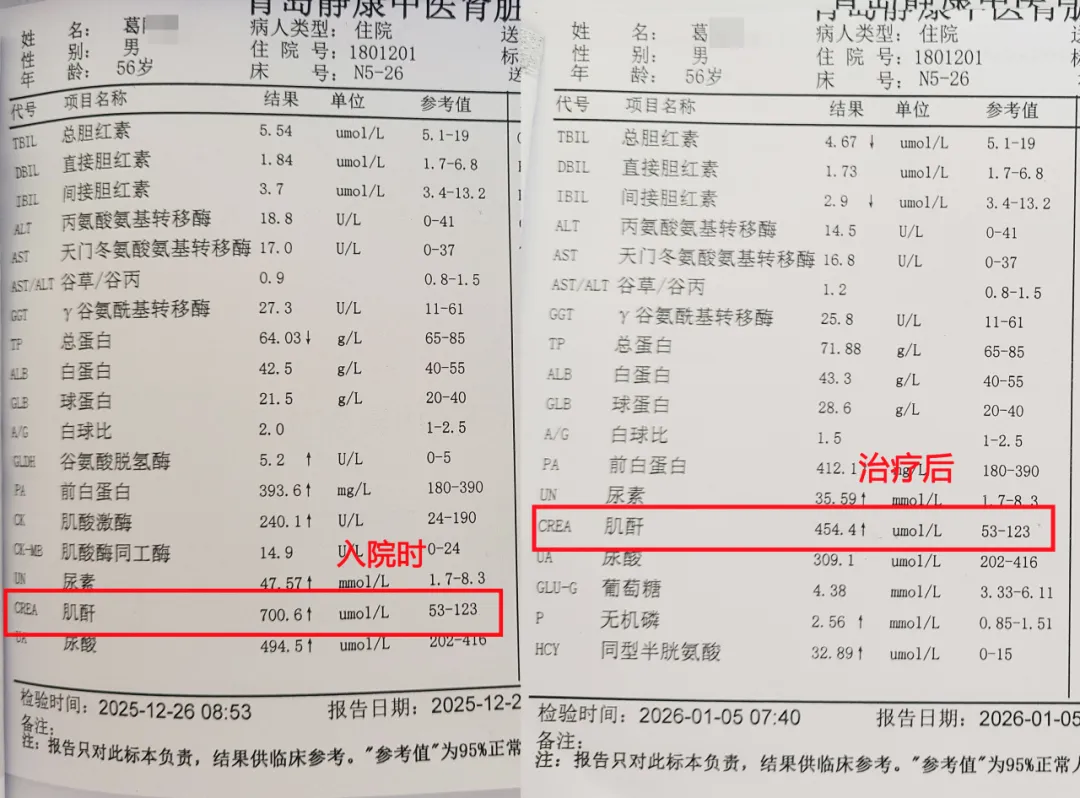 【诊断】 慢性肾脏病5期、肾性骨病、肾性贫血、肾性高血压、代谢性酸中毒、心功能不全、肾性囊肿等13项。 【入院时】 患者血肌酐升高至700.6μmol/L,尿酸494.5μmol/L,尿素47.57mmol/L,双下肢水肿、恶心、腰痛、乏力。 【出院时】 血肌酐下降至454.4μmol/L,尿酸降至309.1μmol/L,达到标准范围,尿素降至35.59mmol/L,成功远离了透析警戒线。 葛先生是一位慢性肾病患者,自2018年在青岛静康中医肾脏病医院接受中西医结合系统治疗后,他的病情一直控制得不错,各项指标稳定,逐渐回归了正常生活。